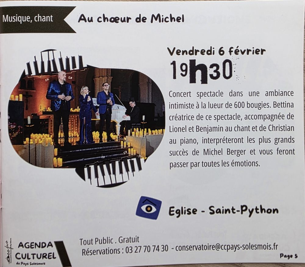 CONCERT “AU CHOEUR DE MICHEL”  GRATUIT, TOUT PUBLIC. ATTENTION RESERVATIONS AU : 03 27 70 74 30 Ăglise de Saint-Python Vendredi 6 fĂ©vrier Ă Â 19h30 Avec le soutien de la RĂ©gion Hauts-de-France et du DĂ©partement du Nord  Venez nombreux partager ce moment musical unique !